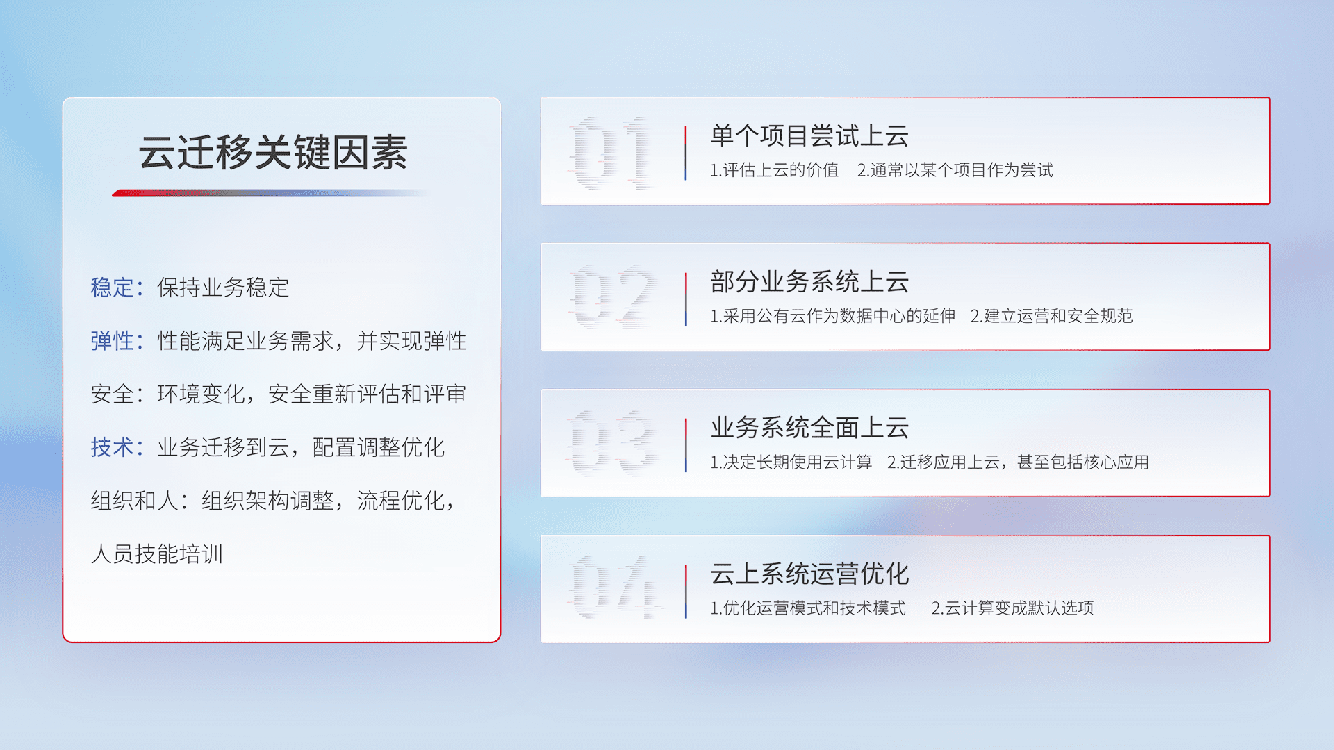 结合实际业务,,,,从规划设计、、、、云平台选型、、、、云原生改造、、数据迁移、、、、集成交付,,,,迁移全过程为客户识别最佳上云路径,,,,做好风险识别管理,,设计网络架构、、、、身份权限、、安全审计合规、、、操作审计、、、、日志审计、、、、监控告警策略、、多站点容灾设计等,,对云上基础设施进行整体规划,,提升IT治理水平,,,以满足弹性、、高可用、、高性能的需求。。。。