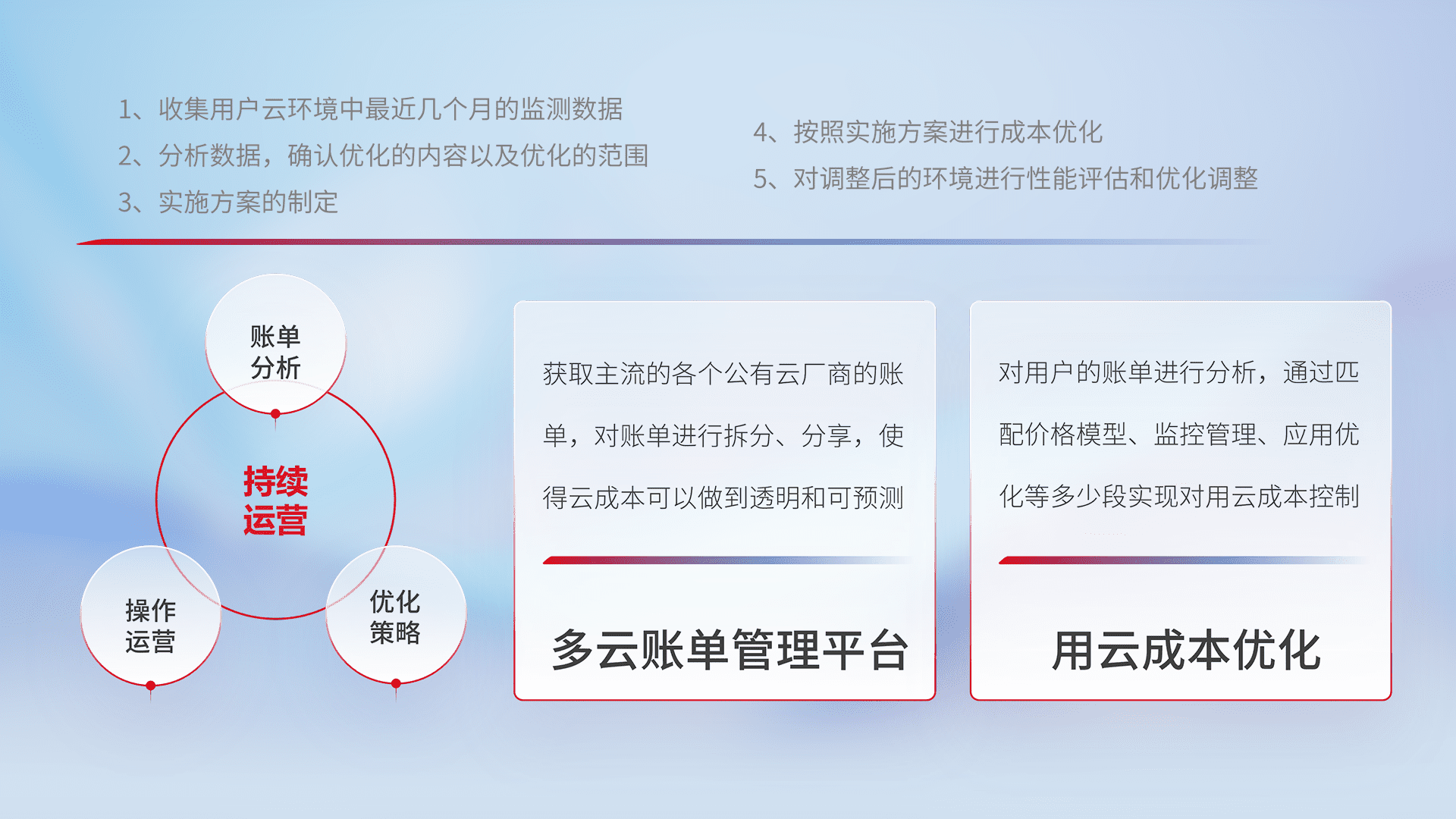 通过灵活运用多种自动化迁移工具,,,,帮助企业用户实现业务和数据高效 、、、稳定的上云迁移和云上迁移,,采用自研多云纳管平台,,以中立管理模式,,,解决多组织、、多云、、、、多运维厂商的复杂关系的管理,,保证多云平台资源配置的一致性,,,实时掌控云资源运行数据,,,,运用智能化工具分析云资源多云平台的管理服务,,,,透明化管理成本支出,,,,用云成本可预测、、、用云费用可优化、、云资源配额有据可依。。。。