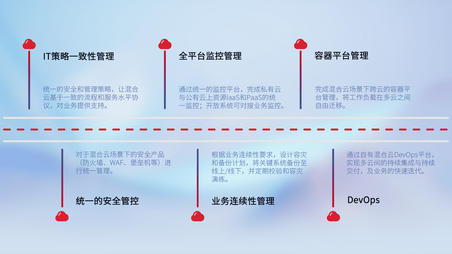 通过多云纳管,,以统一的资源数据模型把客户的云资源进行抽象和封装,,,,进而实现对多云资源的统一操作,,保障云资源管理的可靠性、、稳定性与可用性。。量身定制化运维内容,,配置、、、开发运维、、、、补丁管理、、、、备份、、、、监控、、、认证和访问管理、、、审计和日常巡检等,,,保障在用云过程中的可靠度,,,,稳定度以及高可用率。。