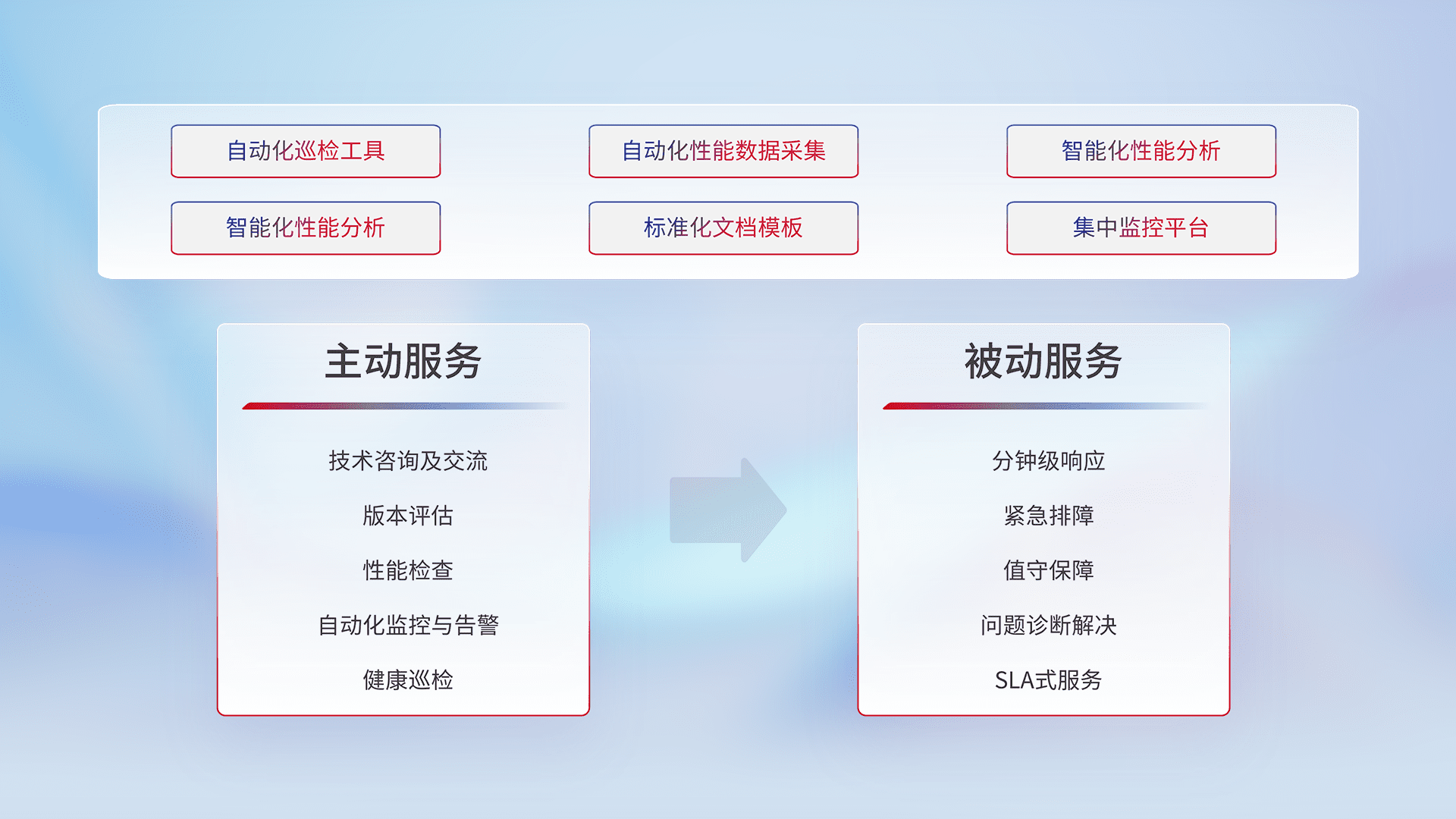 智能化工具和标准化文档,,,,保障服务质量,,提供主动服务(包含技术咨询、、、版本评估、、、性能检查、、自动化监控与告警、、、、健康巡检)和被动服务包含(分钟级响应、、、紧急排障、、值守保障、、问题诊断解决、、SLA服务)。。
